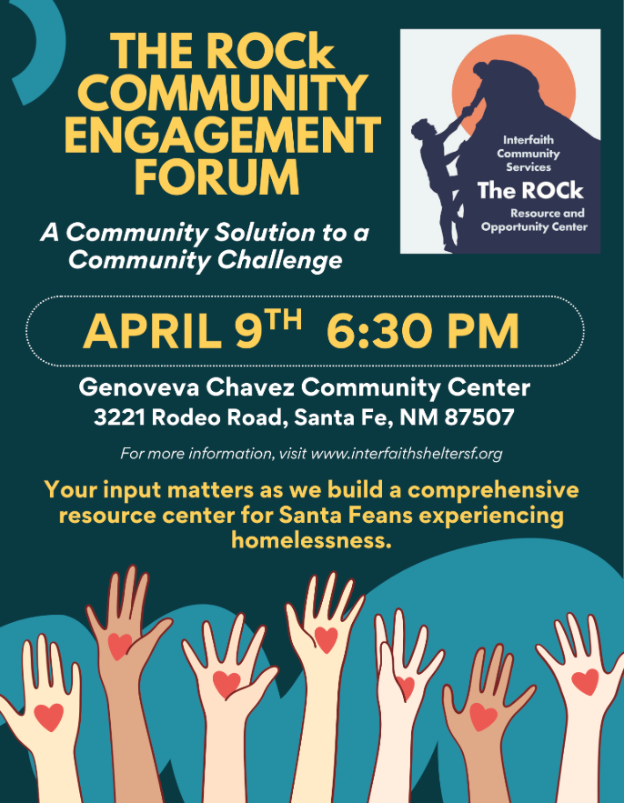 Did you know that Santa Fe does not currently have an emergency shelter for unhoused folks? Although Interfaith Community Services were ousted from their Cerrillos Rd location last summer, the organization has been developing a plan over the last few years for a new facility that will serve multiple needs for the unhoused community. They have secured a location on the southside of town and are currently seeking funding to break ground. A community engagement session is happening Thursday, April 9th from 6:30-8 at the Genoveva Chavez Community Center.